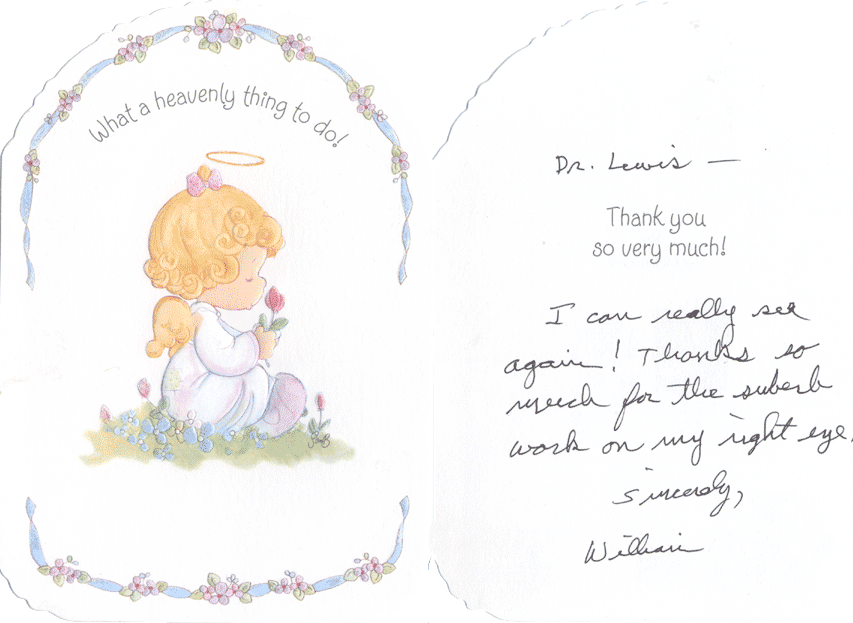 William What a heavenly thing to do! Dr. Lewis _ Thank you so much! I can really see again! Thanks so much for the superb work on my right eye. Sincerely, William BACK TO THE PREVIOUS PAGE